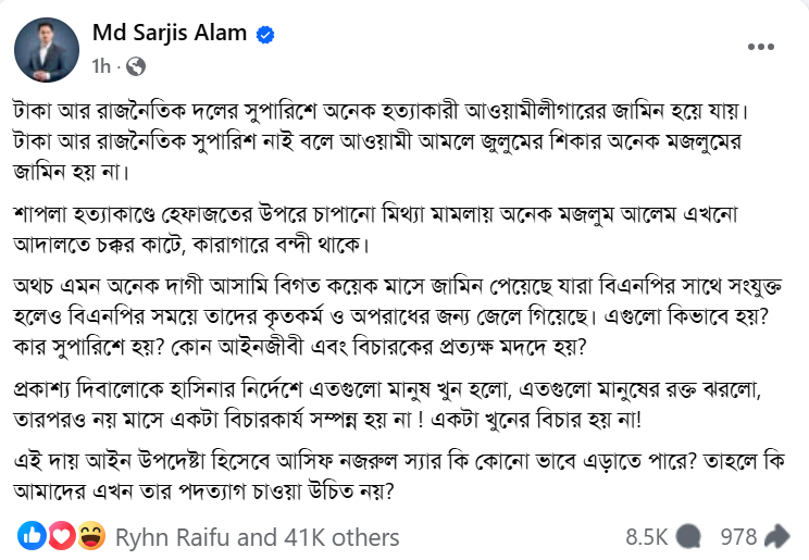 আমাদের কি আসিফ নজরুলের পদত্যাগ চাওয়া উচিত নয়: সারজিসের প্রশ্ন