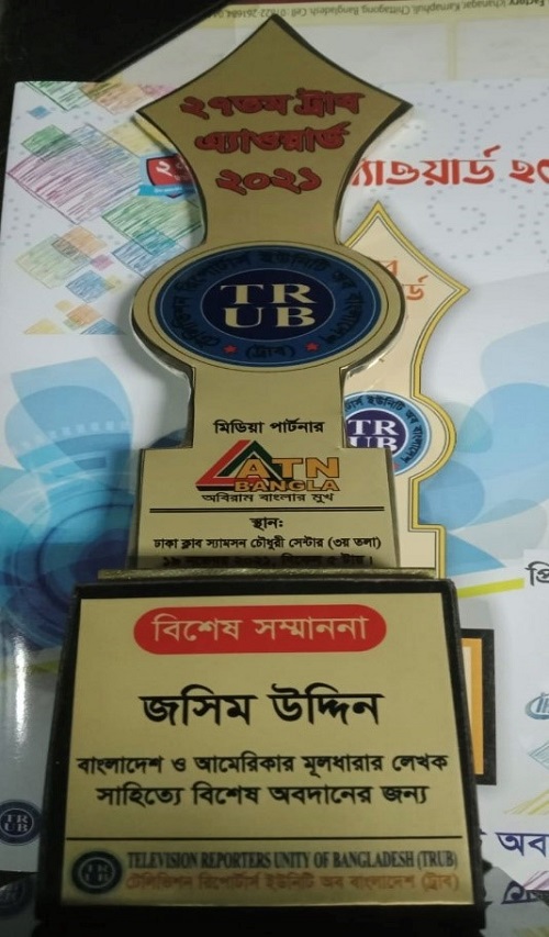 হাকিকুল ইসলাম খোকন, নিউইয়র্ক, যুক্তরাষ্ট্র প্রতিনিধিঃ টেলিভিশন রিপোর্টস ইউনিট অব বাংলাদেশ (ট্রাব) এর ২০২১ এর ২৭ তম আসরে বাংলা এবং ইংরেজী সাহিত্যের আমেরিকার মূলধারার লেখক হিসাবে বিশেষ অবাদানের জন্য সাহিত্য সম্মাননা পেলেন যুক্তরাষ্ট্র বসবাসকারী বাংলাদেশী আমেরিকান জসীম উদ্দীন। জসীম উদ্দীন যুক্তরাষ্ট্রের নিউইয়র্ক অবস্থান করায় প্রধান অতিথি তথ্য ও সম্প্রচার মন্ত্রী ড. হাসান মাহমুদের হাত থেকে উনার পুরস্কার গ্রহন করেন উনার কোম্পানী সুপার ডেনিম টেক্সটাইল লিঃ মিলের পরিচালক জনাব মুহাম্মদ আল তাকি আতিক।