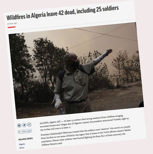 এক প্রতিবেদনে বার্তা সংস্থা এপি আজ ১১ আগস্ট ২০২১, বুধবার জানিয়েছে, রাজধানী আলজিয়ার্সের পূর্বাঞ্চলে ভয়াবহ দাবানল শুরু হয়। দাবানলে ৪২ জন মারা গেছে। নিহতদের মধ্যে ২৫ জন সেনা সদস্য এবং ১৭ জন বেসামরিক নাগরিক।