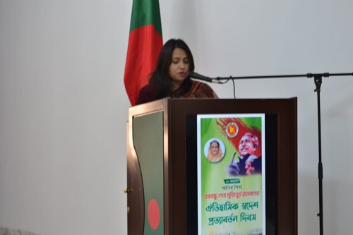 মান্যবর রাষ্ট্রদূত আরও বলেন- ১০ জানুয়ারি বাংলাদেশের ইতিহাসে একটি মাইলফলক। কারণ এই দিনে বঙ্গবন্ধু বাংলাদেশে এসে স্বাধীন বাংলাদেশের পুনঃগঠন ও উন্নয়নে মনোনিবেশ করেন। মাত্র সাড়ে তিন বছরে তিনে যুদ্ধ বিধ্বস্ত বাংলাদেশকে উজ্জীবিত করে তোলেন। এই দিনকে সামনে রেখে বঙ্গবন্ধু যে স্বপ্ন দেখেছিলেন তা বাস্তবায়ন করতে উপস্থিত সকলকে আহবান জানান। এজন্য ১০ জানুয়ারির তাৎপর্য ও ইতিহাস তুলে ধরে তিনি সরকারি কর্মচারী ও উপস্থিত প্রবাসী বাংলাদেশীসহ সকলকে বঙ্গবন্ধুর আদর্শে উজ্জীবিত হয়ে যার যার অবস্থান থেকে তাঁর তাঁর দায়িত্ব পালনে সবার প্রতি অনুরোধ জানান।