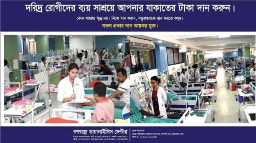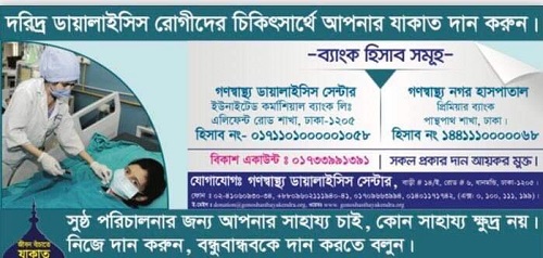 এতে আরো বলা হয়, ডায়লাইসিস সেবা ব্যয়বহুল। করোনাজনিত অতিমারী এই খরচ আরো অনেকগুণ বাড়িয়ে দিয়েছে। আমরা গত বছর ১লা বৈশাখ (১৪ এপ্রিল, ২০২১) থেকে ডায়ালাইসিসের দর কমানোর পরও বিকল কিডনী রোগের রোগীরা শুধুমাত্র টাকার অভাবে নিয়মিত ডায়ালাইসিস করাতে পারছেনা। বাংলাদেশের সর্ববৃহৎ ডায়ালাইসিস সেন্টার ‘গণস্বাস্থ্য ডায়ালাইসিস সেন্টার’ সমাজের অবস্থাসম্পন্ন ব্যক্তিদের সহায়তায় প্রতিদিন গড়ে ৩০০ জন বিকল কিডনী রোগীর নামমাত্র মূল্যে গুণগত মানের সেবা নিশ্চিত করতে চেষ্টা করে যাচ্ছে।