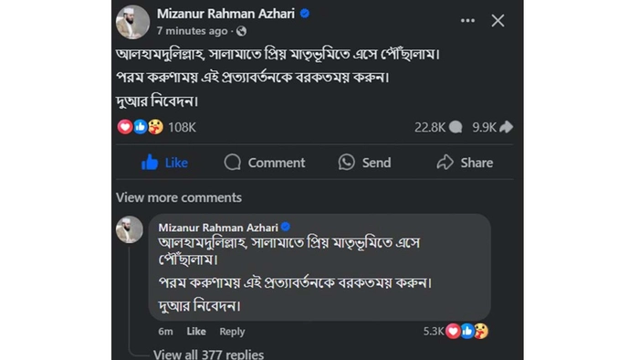 ফেসবুক পোস্টে তিনি লিখেছেন, আলহামদুলিল্লাহ, সালামাতে প্রিয় মাতৃভূমিতে এসে পৌঁছালাম। পরম করুণাময় এই প্রত্যাবর্তনকে বরকতময় করুন। দুআর নিবেদন।