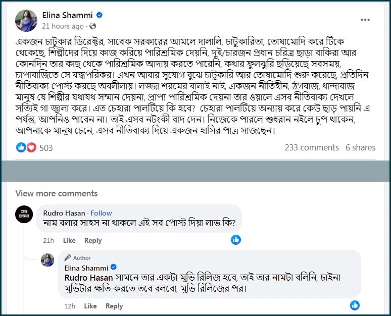 ফেসবুকে নাম প্রকাশ না করে একজন নির্মাতার বিরুদ্ধে পারিশ্রমিক পাওনাসহ নানা অভিযোগ করেন এলিনা শাম্মী। এই অভিনেত্রী লিখেছেন, যে নির্মাতা সাবেক সরকারের আমলে দালালি, চাটুকারিতা, তোষামোদি করে টিকে থেকেছে, শিল্পীদের দিয়ে কাজ করিয়ে পারিশ্রমিক দেয়নি, তার মুখে নীতিবাক্য মানায় না। কথার ফুলঝুরি ছড়িয়েছে সবসময়। চাপাবাজিতে সে বদ্ধপরিকর।