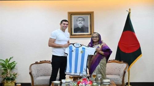 প্রবাস মেলা ডেস্ক: এগারো ঘণ্টার সফরে সোমবার সকালে ঢাকা আসেন আর্জেন্টিনার বিশ্বকাপজয়ী গোলরক্ষক এমিলিয়ানো মার্টিনেজ। বাংলাদেশ সফরে এসে ভক্তদের সঙ্গে তার কোনো অনুষ্ঠানের সূচি না থাকলেও তিনি সময় দিয়েছেন ভক্তদের। সফরের অংশ হিসেবে তিনি দুপুর ২টায় সাক্ষাৎ করেন মাননীয় প্রধানমন্ত্রী শেখ হাসিনার সঙ্গে। এ সময় প্রধানমন্ত্রীকে আর্জেন্টিনার জার্সি উপহার দেন মার্টিনেজ। তার আগে তিনি সাক্ষাৎ করেন দেশসেরা অধিনায়ক মাশরাফী বিন মোর্ত্তজা ও দুই সন্তানের সঙ্গে।