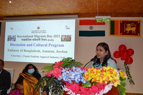 দিবসটি উপলক্ষে ১৮ ডিসেম্বর, ২০২১ তারিখে বাংলাদেশ দূতাবাসের উদ্যোগে জর্ডানের রামথা থানার আল হাসান শিল্প এলাকায় এক আলোচনা সভা ও সাংস্কৃতিক অনুষ্ঠানের আয়োজন করা হয়। জর্ডানের সর্ববৃহৎ গার্মেন্টস ফ্যাক্টরী ক্ল্যাসিক ফ্যাশন এপারেলসের সহযোগিতায় আয়োজিত এ অনুষ্ঠানে জর্ডানে নিযুক্ত বাংলাদেশের মান্যবর রাষ্ট্রদূত নাহিদা সোবহান, ক্ল্যাসিক ফ্যাশনের চেয়ারম্যান জনাব সানাল কুমার, আইএলও, লেবার ইউনিয়নের প্রতিনিধিবৃন্দ, প্রবাসী বাংলাদেশি এবং অনান্য দেশের কর্মীরা অংশগ্রহণ করেন। অনুষ্ঠানের শুরুতে দিবসটি উপলক্ষে প্রদত্ত বাণীসমূহ পাঠ করা হয়। অনুষ্ঠানে মান্যবর রাষ্ট্রদুত বলেন, অভিবাসী কর্মীরা তাদের পরিবার, নিজের দেশ এবং যে দেশে তারা কাজ করেন সেদেশের উন্নয়নে অবদান রাখেন। তিনি সকল অভিবাসী কর্মীর জন্য আন্তর্জাতিক অভিবাসী দিবসের গুরুত্বের কথা তুলে ধরেন। অনুষ্ঠানে ক্ল্যাসিক ফ্যাশনের চেয়ারম্যান, আইএলও এবং লেবার ইউনিয়নের প্রতিনিধিরা বক্তব্য রাখেন। আলোচনা সভা শেষে বাংলাদেশি, ভারতীয়, শ্রীলংকান ও নেপালী অভিবাসী কর্মীদের অংশগ্রহণে এক মনোজ্ঞ সাংস্কৃতিক অনুষ্ঠান পরিবেশিত হয়।