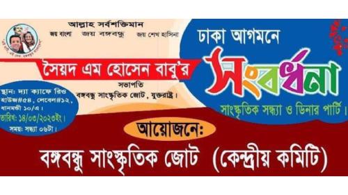 প্রেস বিজ্ঞপ্তি: বঙ্গবন্ধু সাংস্কৃতিক জোট (কেন্দ্রীয় কমিটি)’র উদ্যোগে ১৪ মার্চ ২০২৩ ঢাকাস্থ ধানমন্ডিতে প্রবাসী সাংবাদিক, বঙ্গবন্ধু সাংস্কৃতিক জোট যুক্তরাষ্ট্র শাখার কেন্দ্রীয় কমিটির সভাপতি সৈয়দ এম হোসেন বাবুর ঢাকা আগমন উপলক্ষ্যে সংবর্ধনা, সাংস্কৃতিক সন্ধ্যা ও ডিনারের আয়োজন করা হয়েছে।