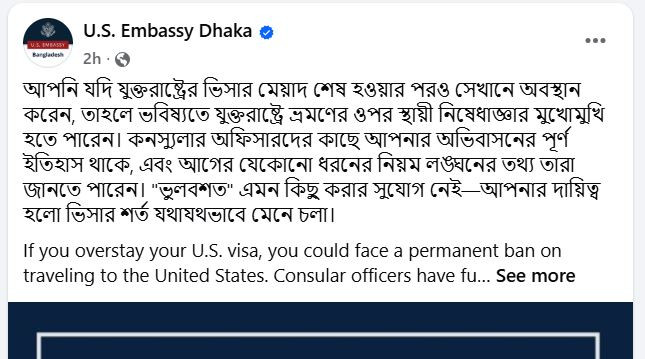 দূতাবাস তাদের পোস্টে স্পষ্ট করে বলেছে, আপনি যদি যুক্তরাষ্ট্রের ভিসার মেয়াদ শেষ হওয়ার পরও সেখানে অবস্থান করেন, তাহলে ভবিষ্যতে যুক্তরাষ্ট্রে ভ্রমণের ওপর স্থায়ী নিষেধাজ্ঞার মুখোমুখি হতে পারেন। তারা আরও জানায়, কনস্যুলার কর্মকর্তারা ভিসা আবেদনকারীদের অভিবাসনের সম্পূর্ণ ইতিহাস জানতে পারেন এবং আগের যেকোনো নিয়ম ভঙ্গের তথ্যও তাদের কাছে থাকে। তাই ‘ভুলবশত’ এমন কিছু করার কোনো সুযোগ নেই– ভিসার সব শর্ত ঠিকঠাকভাবে মেনে চলা আবেদনকারীরই দায়িত্ব।
