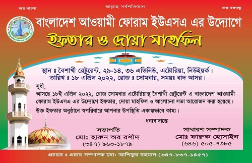 হাকিকুল ইসলাম খোকন, নিউইয়র্ক, যুক্তরাষ্ট্র প্রতিনিধিঃ ১৮ই এপ্রিল ২০২২ইং সোমবার, বিকাল সাড়ে ৬টায় বাংলাদেশ আওয়ামী ফোরাম ইউএসএ-এর ইফতার ও দোয়া মাহফিল এবং ঐতিহাসিক মুজিব নগর দিবসের আলোচনা সভার আয়োজন করা হয়েছে। উক্ত অনুষ্ঠানে সকল প্রবাসীদের সাদর আমন্ত্রণ জানিয়েন বাংলাদেশ আওয়ামী ফোরাম ইউএসএ সভাপতি হারুন অর রশীদ ও সাধারণ সম্পাদক ফারুক হোসাইন ।