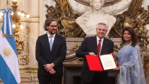 হাকিকুল ইসলাম খোকন, নিউইয়র্ক, যুক্তরাষ্ট্র প্রতিনিধি: দক্ষিণ আমেরিকায় বাংলাদেশের একমাত্র রাষ্ট্রদূত সাদিয়া ফয়জুননেসা ২৯ আগস্ট ২০২২, সোমবার আর্জেন্টিনার রাষ্ট্রপতি আলবার্তো ফার্নান্দেজের নিকট পরিচয়পত্র পেশ করেন। রাষ্ট্রদূত সাদিয়া ফয়জুননেসা ব্রাজিলের রাজধানী ব্রাসিলিয়াতে নিযুক্ত থেকে পাশ্ববর্তী দেশ আর্জেন্টিনার সমবর্তী দায়িত্ব পালন করবেন। নবনিযুক্ত রাষ্ট্রদূত বাংলাদেশের রাষ্ট্রপতি, প্রধানমন্ত্রী ও জনগণের পক্ষ থেকে আর্জেন্টিনার রাষ্ট্রপতিকে উষ্ণ শুভেচ্ছাবার্তা জানান। এ সময় আর্জেন্টিনার পররাষ্ট্রমন্ত্রী সান্টিয়াগো আন্দ্রেজ কাফিরো উপস্থিত ছিলেন।