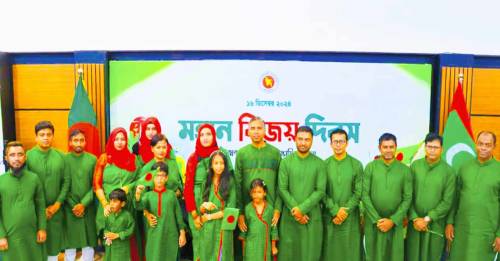 মনিরুজ্জামান মনির, মালে, মালদ্বীপ প্রতিনিধি: ১৬ ডিসেম্বর ২০২৪ বাংলাদেশ হাই কমিশন মালদ্বীপ কর্তৃক দিনব্যাপী যথাযথ মর্যাদা ও উৎসাহ উদ্দীপনার মধ্য দিয়ে মহান বিজয় দিবস ২০২৪ পালন করা হয়। প্রত্যুষে বাংলাদেশ হাই কমিশন প্রাঙ্গনে পতাকা উত্তোলন এবং জাতীয় সঙ্গীত পরিবেশনের মাধ্যমে অনুষ্ঠানের শুরু হয়।