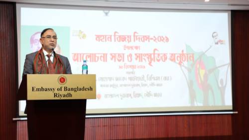 মহান বিজয় দিবস উপলক্ষ্যে সকালে দূতাবাস প্রাঙ্গণে পতাকা উত্তোলন করেন রাষ্ট্রদূত ড. মোহাম্মদ জাবেদ পাটোয়ারী। এরপর রাষ্ট্রদূত দূতাবাসে স্থাপিত অস্থায়ী স্মৃতিসৌধে ফুল দিয়ে শহীদদের প্রতি শ্রদ্ধা নিবেদন করেন। বাংলাদেশ কমিউনিটির বিভিন্ন সংগঠন ফুল দিয়ে স্মৃতিসৌধে শ্রদ্ধা নিবেদন করেন। এসময় দূতাবাসের কর্মকর্তাগণ ও রিয়াদে বসবাসরত বিভিন্ন শ্রেণী পেশার অভিবাসীরা উপস্থিত ছিলেন।