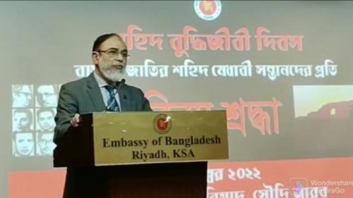 মো: জাহাঙ্গীর আলম হৃদয়, রিয়াদ, সৌদি আরব প্রতিনিধি: ১৪ ডিসেম্বর ২০২২ সৌদি আরবের রিয়াদস্থ বাংলাদেশ দূতাবাসে যথাযথ মর্যাদায় শহীদ বুদ্ধিজীবী দিবস পালিত হয়েছে। বিকালে দূতাবাসের অডিটোরিয়ামে এ উপলক্ষ্যে এক আলোচনা সভার আয়োজন করা হয়।