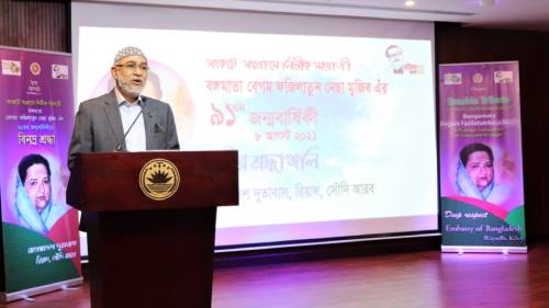 অনুষ্ঠানে সৌদি আরবে নিযুক্ত বাংলাদেশের রাষ্ট্রদূত ড. মোহাম্মদ জাবেদ পাটোয়ারী বিপিএম (বার) বলেন, বাংলাদেশের স্বাধীনতা সংগ্রামে বঙ্গমাতা ফজিলাতুন নেছা মুজিবের অবদান অপরিসীম। বাংলাদেশের প্রতিটি আন্দোলন সংগ্রামে তিনি বঙ্গবন্ধু শেখ মুজিবুর রহমানকে সাহস ও প্রেরণা জুগিয়েছেন। বঙ্গবন্ধুর সহধর্মিণী হিসেবে তিনি দেশের ক্রান্তিলগ্নে অনবদ্য ভূমিকা রেখেছেন। একাধারে তিনি তাঁর সকল সন্তানদের দেশপ্রেম ও মানবতার জন্য কাজ করা শিখিয়েছেন।