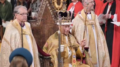 এরপর সাড়ে ৩শ’ বছরের পুরনো ৪শ’ রত্ন-পাথরখচিত মুকুট রাজা তৃতীয় চার্লসের মাথায় পরিয়ে দেয়া হয়। শেষ পর্যায়ে সিংহাসনে আরোহণ করেন রাজা তৃতীয় চার্লস। তার বড় ছেলে প্রিন্স উইলিয়াম এই সময় বাবার প্রতি সম্মান দেখিয়ে হাঁটু বেড়ে ঝুঁকে বসেন। এসময় রাজার সহধর্মিণী হিসেবে কুইন কনসোর্ট ক্যামিলাকেও মুকুট পরানো হয়।