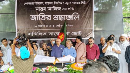 প্রবাস মেলা ডেস্ক: পাবনার কৃতী সন্তান মাসুম আজিজের প্রতি কেন্দ্রীয় শহীদ মিনারে শ্রদ্ধা নিবেদন করেন সর্বস্তরের জনগণ। সম্মিলিত সাংস্কৃতিক জোটের আয়োজনে ১৮ অক্টোবর ২০২২, মঙ্গলবার সকালে তার মরদেহ সেখানে রাখা হয়।