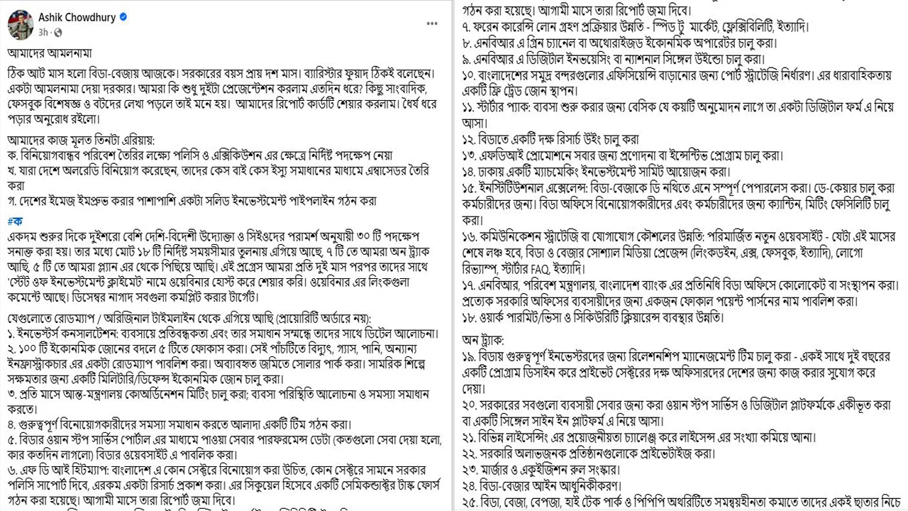 চৌধুরী আশিক তার স্ট্যাটাসে বিগত আট মাসে বিডা-বেজার কাজের বিবরণ তুলে ধরেন, যেটিকে তিনি ‘আমলনামা’ হিসেবে উল্লেখ করেন।
