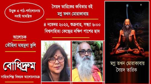 প্রেস বিজ্ঞপ্তি: আগামী ৪ নভেম্বর ২০২২, শুক্রবার, সন্ধ্যা ৬টায় বিশ্বসাহিত্য কেন্দ্রের দক্ষিণ পাশের ছাদে সাহিত্যশিল্প বিষয়ক আলোচনাচক্র বোধিদ্রুম অনুষ্ঠিত হবে।এবারের আলোচনা হবে সৈয়দ তারিকের কবিতার বই ‘মগ্ন তখন মোরাকাবায়’র ওপর। পাঠ-পর্যালোচনায় থাকবেন তৌহিদা মাহমুদা তুলি।