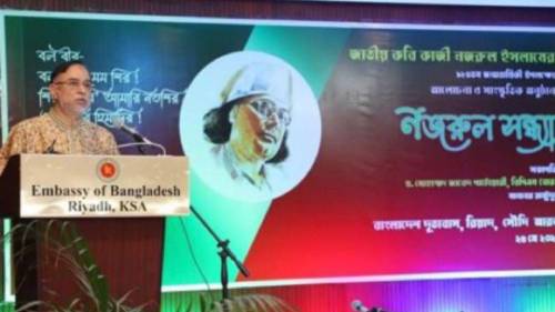 অনুষ্ঠানে সৌদি আরবে নিযুক্ত বাংলাদেশের রাষ্ট্রদূত ড. মোহাম্মদ জাবেদ পাটোয়ারী বলেন, সৌদি আরবে কবি কাজী নজরুল ইসলামের জীবন ও সাহিত্য কর্ম নিয়ে বিভিন্ন বিশ্ববিদ্যালয়ে গবেষণা, সেমিনার ও সাহিত্য চর্চার উদ্যোগ নেওয়া হয়েছে।