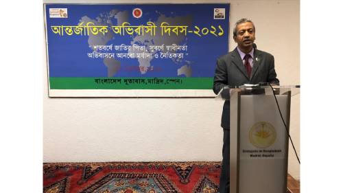 কবির আল মাহমুদ, মাদ্রিদ, স্পেন থেকে: প্রতিবছরের মতো মাদ্রিদে বাংলাদেশ দূতাবাসের শ্রম উইং এর উদ্যোগে ১৮ ডিসেম্বর ২০২১, শনিবার আন্তর্জাতিক ‘অভিবাসী দিবস’ উদ্যাপন করা হয়। ‘শতবর্ষে জাতির পিতা, সুবর্ণে স্বাধীনতা, অভিবাসনে আনব মর্যাদা ও নৈতিকতা’ প্রতিপাদ্য সামনে রেখে মাদ্রিদে বসবাসরত প্রবাসী বাংলাদেশিদের অংশগ্রহণে দূতাবাসের মিলনায়তনে এই আলোচনা সভার আয়োজন করা হয়। দূতাবাসের প্রথম (সচিব শ্রম) মুতাসিমুল ইসলামের সঞ্চালনায় পবিত্র কোরআন থেকে তিলাওয়াতের মধ্য দিয়ে দিবসটি উপলক্ষ্যে আয়োজিত অনুষ্ঠান শুরু হয় সকাল ১১ টায়। অনুষ্ঠানে প্রধান অতিথি ছিলেন স্পেনে নিযুক্ত বাংলাদেশের রাষ্ট্রদূত মোহাম্মদ সারওয়ার মাহমুদ, এনডিসি।