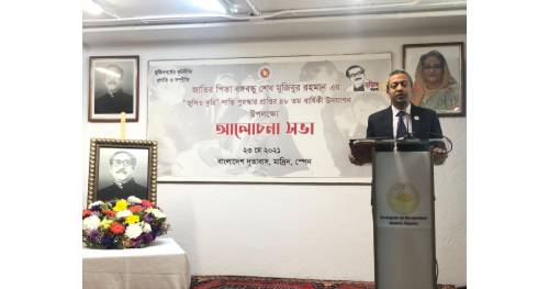 কবির আল মাহমুদ, মাদ্রিদ, স্পেন থেকে: যথাযোগ্য মর্যাদা ও উৎসাহ-উদ্দীপনার মধ্য দিয়ে জাতির পিতা বঙ্গবন্ধু শেখ মুজিবুর রহমানের ‘জুলিও কুরি’ শান্তি পদক প্রাপ্তির ৪৮তম বার্ষিকী উদযাপন করেছে স্পেনের রাজধানী মাদ্রিদে অবস্থিত বাংলাদেশ দূতাবাস। এ উপলক্ষে ২৩ মে ২০২১, রবিবার কোভিড-১৯ এর প্রেক্ষাপটে যথাযথ স্বাস্থ্যবিধি অনুসরণ করে আয়োজিত এ অনুষ্ঠানে জাতির পিতা বঙ্গবন্ধু শেখ মুজিবুর রহমানের ‘জুলিও কুরি’ শান্তি পদক প্রাপ্তির ৪৮তম বার্ষিকী এবং এর তাৎপর্য নিয়ে দূতাবাস মিলনায়তনে আলোচনা সভা অনুষ্ঠিত হয়। আলোচনা সভায় দূতাবাসের কর্মকর্তা কর্মচারীরা অংশ নেন।