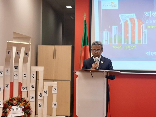 স্থানীয় সময় সন্ধ্যা ৬ টায় কাসা এশিয়া এর সম্মেলন কক্ষে বাংলাদেশ দূতাবাসের উদ্যোগে বিশেষ আলোচনা ও সাংস্কৃতিক অনুষ্ঠানের আয়োজন করা হয়। আলোচনার শুরুতেই সম্মেলন কক্ষে নির্মিত অস্থায়ী শহীদ মিনারে বাংলাদেশ দূতাবাসের কর্মকর্তারা পুষ্পাঞ্জলি অর্পণ করেন। দূতাবাসের কাউন্সেলর (লেবার উইং) মো: মোতাসিমুল ইসলামের পরিচালনায় অনুষ্ঠিত ভাষা দিবসের আলোচনায় রাষ্ট্রদূত মোহাম্মদ সারওয়ার মাহমুদ বাংলা ভাষার পরিধি বিস্তৃতির প্রসঙ্গ টেনে বলেন, আমাদের বাংলা ভাষা বিশ্বের চতুর্থ বৃহত্তম ভাষা। প্রায় ২৫০ মিলিয়ন মানুষ এ ভাষায় কথা বলে। চীনা, স্প্যানিশ ও ইংরেজীর পরই এর স্থান। বাংলাদেশ ছাড়াও বাংলা ভারতের পশ্চিমবঙ্গ, ত্রিপুরা, আসামের আন্দামান ও নিকোবর দ্বীপপুঞ্জ কয়েকটি অঞ্চলে সরকারী ভাষা হিসেবে স্বীকৃত। এছাড়াও ভারতীয় সংবিধান দ্বারা স্বীকৃত ২৩ টি সরকারী ভাষার মধ্যে বাংলা অন্যতম। এছাড়া আফ্রিকার সিয়েরা লিয়নের দ্বিতীয় সরকারী ভাষা বাংলা। বাংলাদেশের প্রধানমন্ত্রী শেখ হাসিনার নেতৃত্বে বাংলাদেশ উন্নয়নের ধারায় রয়েছে উল্লেখ করে রাষ্ট্রদূত মহান শহিদ দিবস ও আন্তর্জাতিক মাতৃভাষা দিবসের চেতনায় উদ্বুদ্ধ হয়ে সবাইকে দেশ গড়ার কাজে আত্মনিয়োগের আহ্বান জানান।
