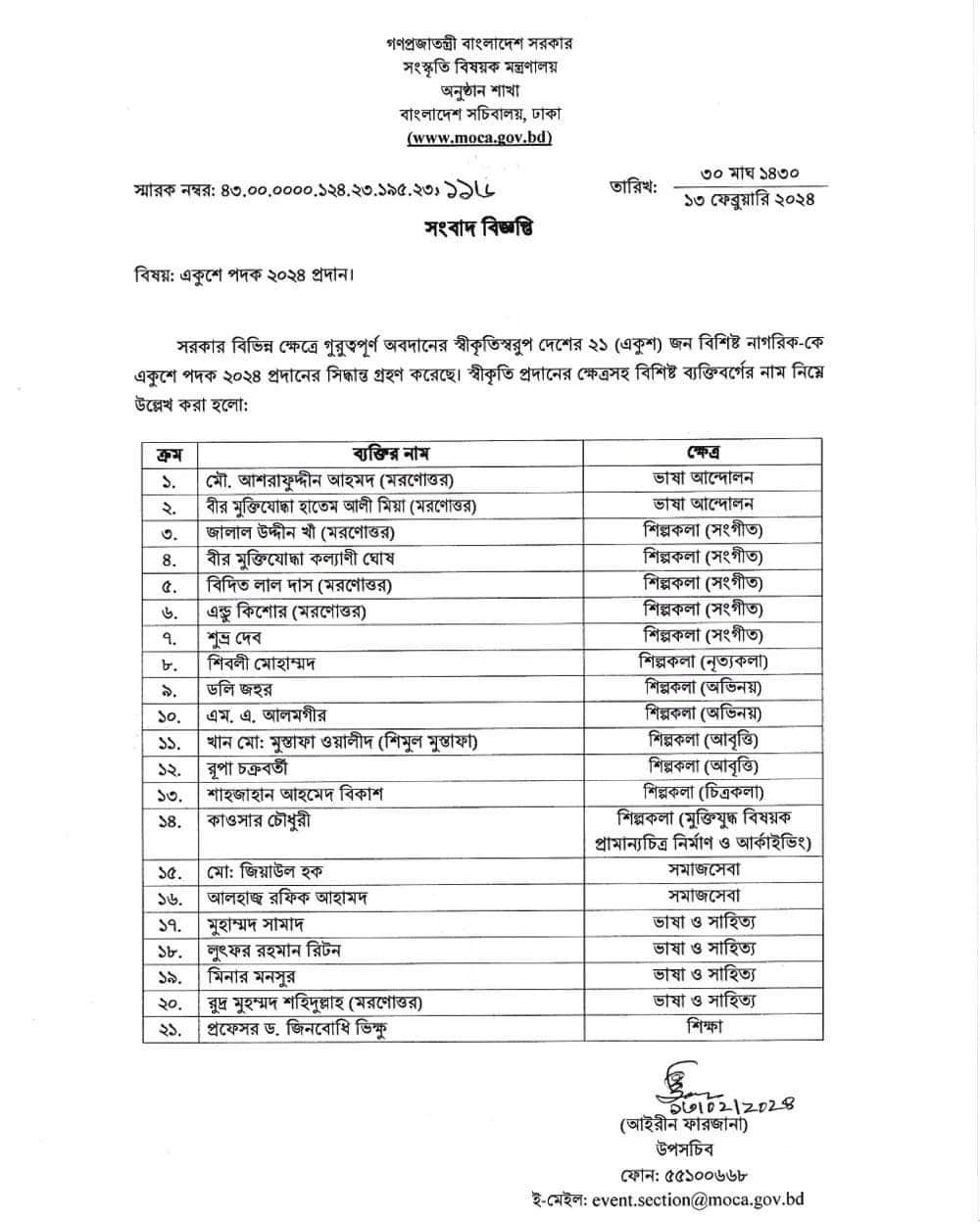 ১৩ ফেব্রুয়ারি ২০২৪, মঙ্গলবার এক বিজ্ঞপ্তিতে এ তথ্য জানায় সংস্কৃতি মন্ত্রণালয়। ভাষা আন্দোলন, শিল্পকলা, ভাষা ও সাহিত্যসহ বিভিন্ন ক্ষেত্রে উল্লেখযোগ্য অবদানের জন্য এ পদক দেওয়া হয়।