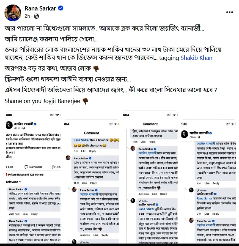 এক পর্যায়ে সেই কথপোকথনের স্ক্রিনশট সামাজিক যোগাযোগমাধ্যমে প্রকাশ করে দেন। শুধু তাই নয়, রানা সরকার ক্যাপশনে লেখেন, আর পারল না মিথ্যেগুলো সামলাতে, আমাকে ব্লক করে দিলো জয়জিৎ ব্যানার্জী, আমি চ্যালেঞ্জ করলাম পালিয়ে গেল। ওনার পরিবারের লোক বাংলাদেশের নায়ক শাকিব খানের ৩০ লাখ টাকা আত্মসাৎ করে পালিয়ে যাচ্ছেন, কেউ শাকিব খানকে জিজ্ঞেস করুন জানতে পারবেন। তারপরও বড় বড় কথা, আজব লোক। স্ক্রিনশটগুলো থাকল আইনি ব্যবস্থা নেওয়ার জন্য। এইসব মিথ্যাবাদী অভিনেতা নিয়ে আমাদের জগৎ, কী করে বাংলা সিনেমার ভালো হবে?