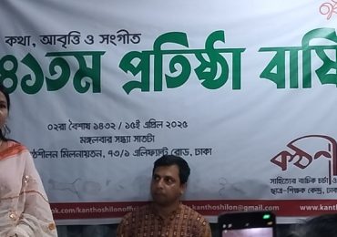 প্রবাস মেলা ডেস্ক: কথা, আবৃত্তি ও সংগীতের মধ্য দিয়ে সাহিত্যের বাচিক চর্চা ও প্রসারের প্রতিষ্ঠান কণ্ঠশীলনের ৪১ বছর পূর্তি উৎসব উদ্যাপিত হয়েছে। ২ বৈশাখ ১৪৩২, মঙ্গলবার সন্ধ্যা সাতটায় রাজধানীর এলিফ্যান্ট…
